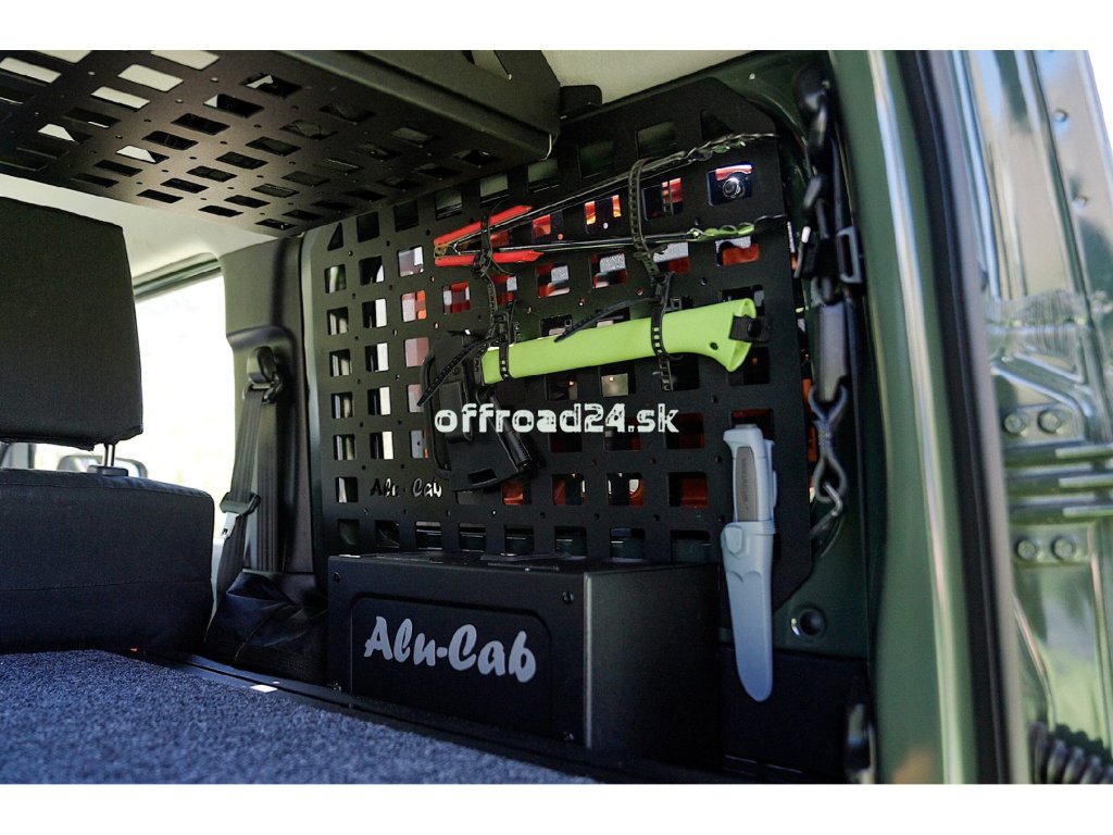 Interiérový MOLLE panel Alu-Cab je navrhnutý na zvýšenie funkčnosti batožinového priestoru vozidla Suzuki Jimny. Umožňuje prehľadné a bezpečné uchytenie výbavy priamo na bočnú stenu interiéru, vďaka čomu zostáva priestor uprataný a všetko potrebné je vždy po ruke.