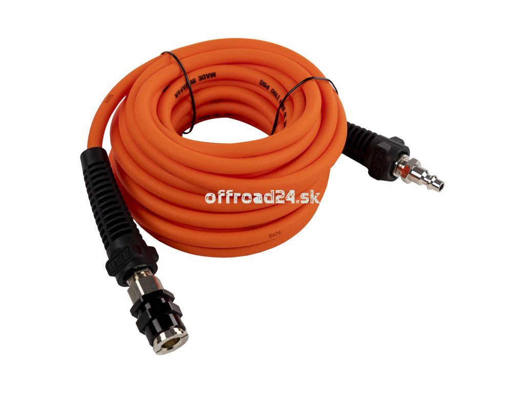 Hadica je vyrobená z vysoko kvalitného materiálu, ktorý zostáva ohybný aj pri nízkych teplotách a zároveň sa nedeformuje pri vysokom zaťažení. Na oboch koncoch je osadená štandardnými americkými rýchlospojkami (US Standard – samec a samica), ktoré zabezpečujú tesné spojenie bez úniku vzduchu. Na offroad24.sk nájdete túto hadicu v jasnej oranžovej farbe, ktorá zvyšuje bezpečnosť v kempe alebo na trati, pretože je dobre viditeľná na zemi.