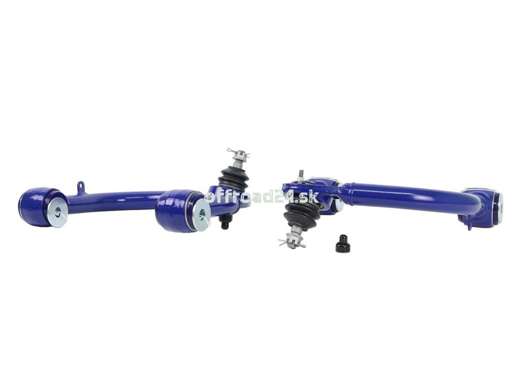 Sada zosilnených horných ramien SuperPro s pevným vyosením (offsetom) pre vozidlá so zdvihom podvozku o 25 až 75 mm. Ramená automaticky korigujú geometriu pridaním 2 stupňov záklonu čapu (caster) a negatívneho odklonu. Osadené prémiovými polyuretánovými silentblokmi a vysokopevnostnými čapmi pre maximálnu krížiteľnosť nápravy.