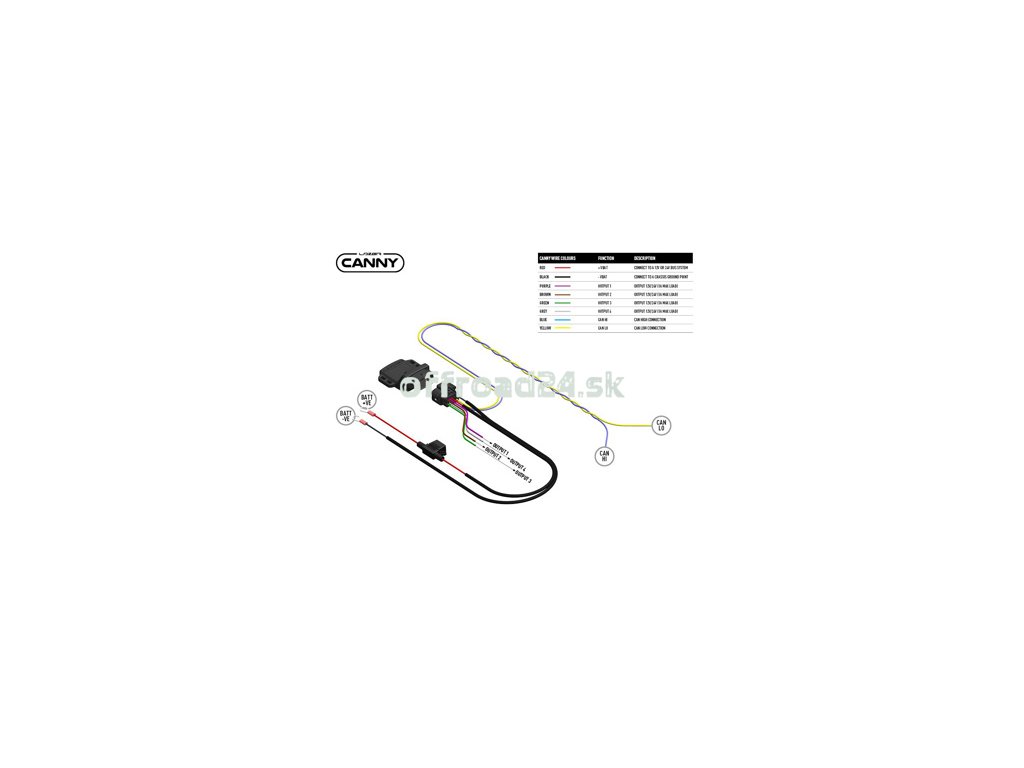 Pripojenie k CAN vedeniu vozidla sa vykonáva prostredníctvom priloženého káblového zväzku, s modrými (CAN Hi) a žltými (CAN Lo) vodičmi, ktoré sú dodávané s tepelne zmršťovacími krimpovacími spojmi v automobilovej kvalite na vytvorenie vodotesných spojení. Priložený káblový zväzok obsahuje aj poistenú kladnú batériu a uzemňovacie vedenie. Okrem toho sú k dispozícii 4 výstupné vedenia, z ktorých každé je programovateľné na reakciu na rôzne vstupy, či už: diaľkové svetlá, pozičné svetlá, zapaľovanie, spätný chod atď., a ktoré sú kompatibilné s každou z našich vozidlových súprav (ak je požadovaný výstup >1Amp).