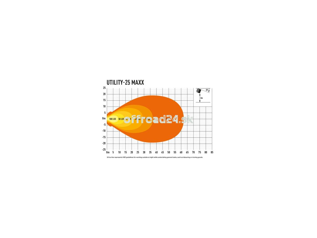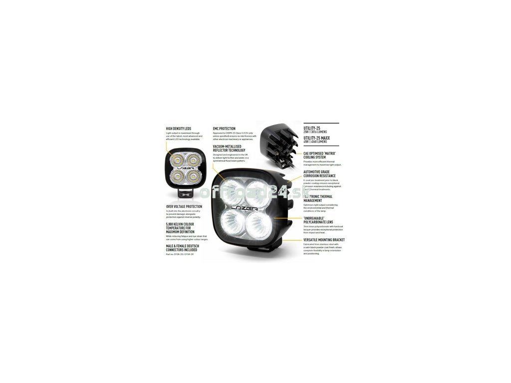 Utility-25 MAXX meria 80 mm x 80 mm a môže byť prevádzkovaný medzi 9 a 32 V. Používa vysoko efektívne 11-W LED od svetovo popredného dodávateľa dizajnu a výroby LED. Ako pri všetkých produktoch Lazer, farebná teplota LED je starostlivo vybraná na 5000 Kelvin na maximalizáciu ostrosti a definície oblasti pred vozidlom, bez spôsobenia únavy alebo zaťaženia, ktoré môže vzniknúť použitím LED s vyšším farebným rozsahom. Vákuovo metalizovaná optika využíva 4 560 surových lúmenov a poskytuje rozptýlenie 78 stupňov (na 10 % špičkovej intenzity). Pôsobivý svetelný výkon je udržiavaný vysokou tepelnou vodivosťou „Matrix" chladiaceho systému, ktorý umožňuje prevádzkovať lampu s vyšším prúdom ovládača bez ovplyvnenia životnosti samotných LED.