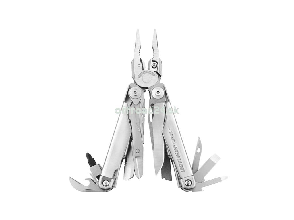 Leatherman Surge je multifunkčný nástroj, ktorý predstavuje surovú silu. Silné kliešte Surge vám poskytnú väčšiu upínaciu silu pri menšej sile a rukoväť je tvarovaná tak, aby ste mali najistejší úchop pri použití bočných kliešť a kliešťí. Okrem pevného vymeniteľného adaptéra na hrot má Surge jedinečnú možnosť výmeny lopatky. Okrem píly a pilníka, ktoré sú súčasťou Surge, môžete použiť aj štandardné čepele s T-vretenom. Všetky čepele sa zablokujú pre väčšiu bezpečnosť pri práci. Keď potrebujete silný multifunkčný nástroj, vyberte si Surge! 25-ročná záruka Leatherman.