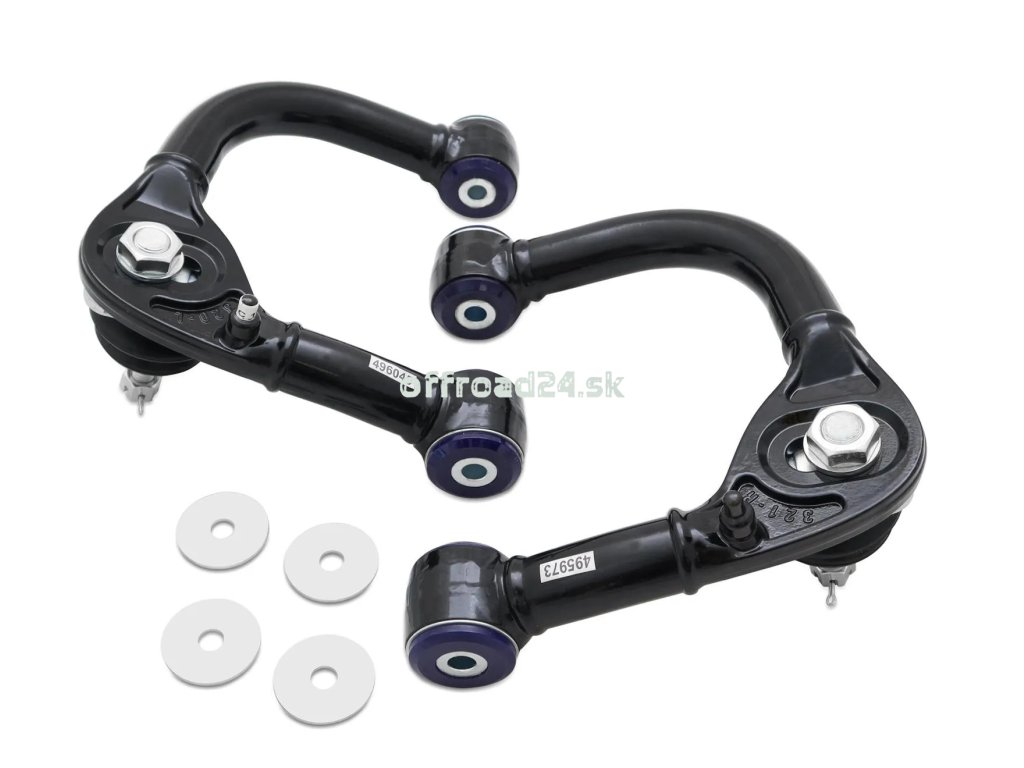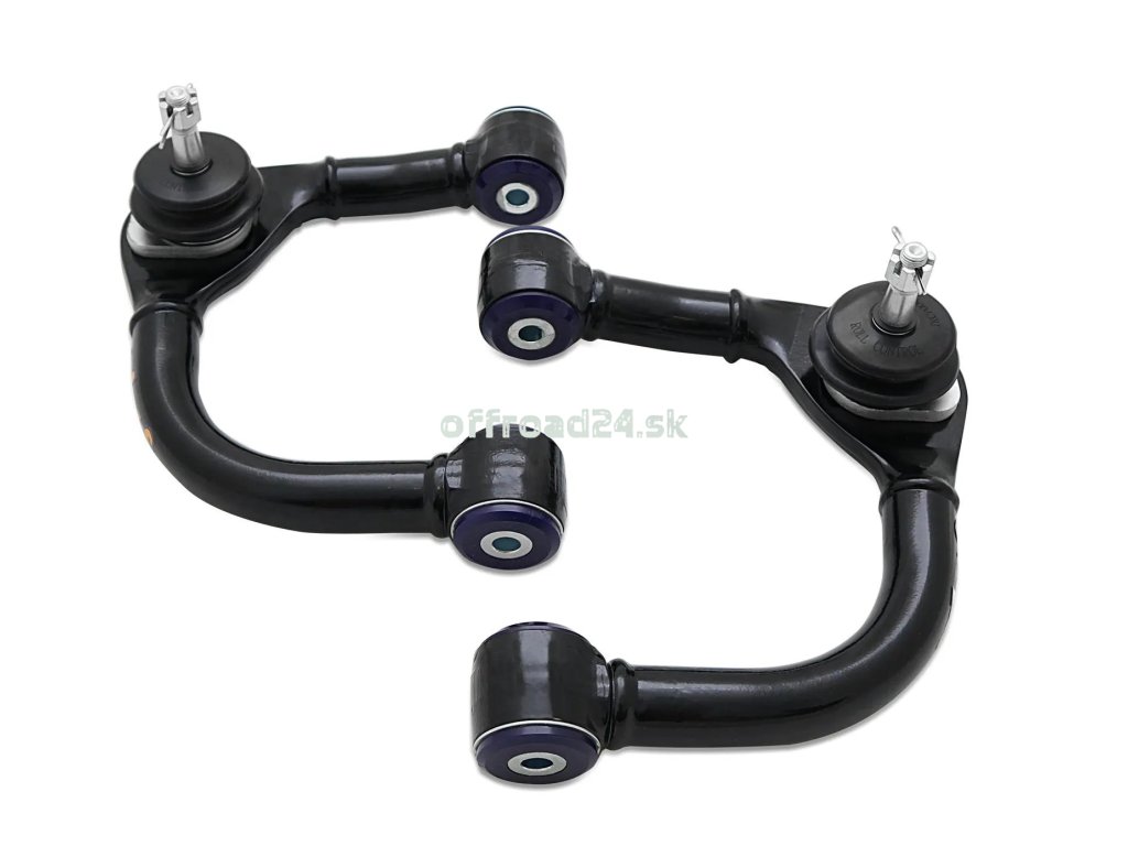 Prémiová sada nastaviteľných horných ramien SuperPro navrhnutá pre vozidlá Toyota Hilux so zvýšeným podvozkom o 25 až 75 mm. Vďaka unikátnemu nastaviteľnému čapu umožňujú korekciu záklonu (caster) a odklonu (camber) v rozsahu +/- 1,5 stupňa. Osadené špičkovými polyuretánovými silentblokmi pre maximálnu presnosť a odolnosť v teréne.