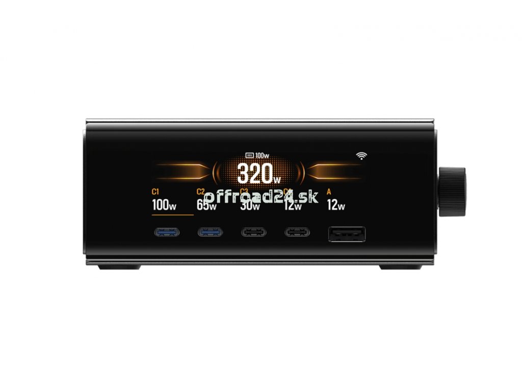 Táto stolová nabíjačka má štyri porty USB-C a jeden port USB-A a kontaktné pogo-piny, ktoré umožňujú bezdrôtové nabíjanie kompatibilných powerbánk. Celkový výstupný výkon až 320 W poskytuje možnosť napájať až šesť zariadení súčasne.