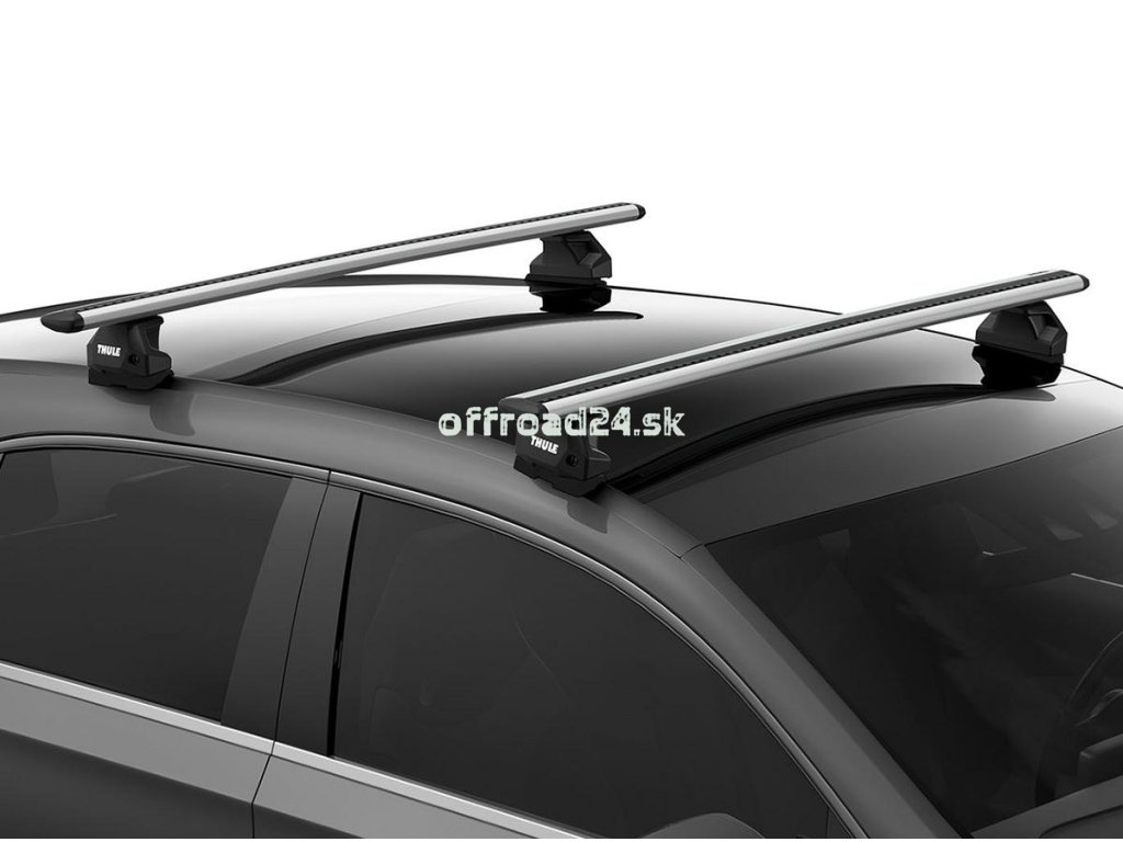 Kompletný set nehlučných strešných nosičov Thule s presahom, pre väčšiu prepravnú kapacitu. Vybavený T-drážkou a zámkami.