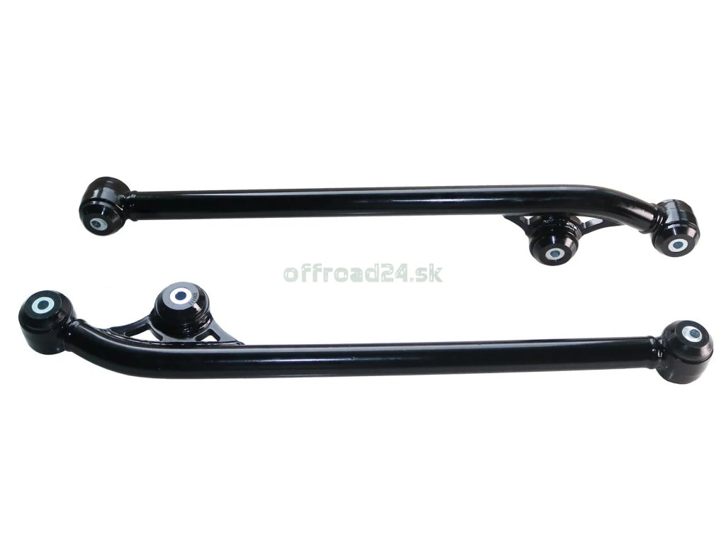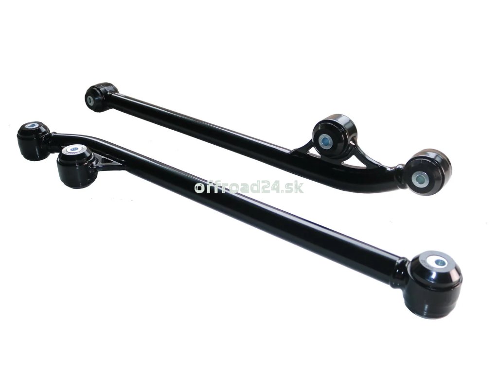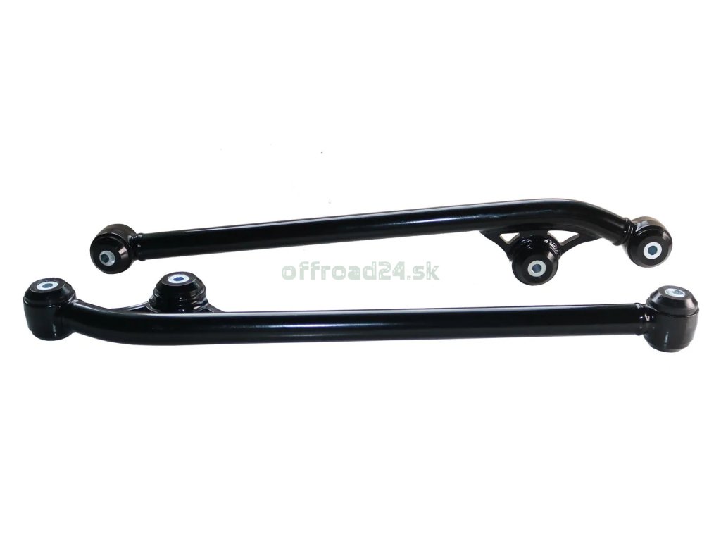 Ramená majú pevne nastavenú geometriu (fixed offset), ktorá vracia záklon čapu do optimálnych hodnôt špeciálne pri vozidlách s liftom. Sú vyrobené z vysokopevnostnej ocele, ktorá je výrazne odolnejšia voči mechanickému poškodeniu v teréne než pôvodné diely. Súčasťou ramien sú predinštalované hybridné polyuretánové silentbloky SuperPro s tvrdosťou 80 Shore A. Tieto puzdrá zabezpečujú presné vedenie nápravy, eliminujú nežiaduce vôle a zároveň zachovávajú komfort jazdy bez prenosu vibrácií (NVH).