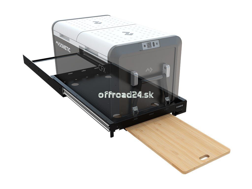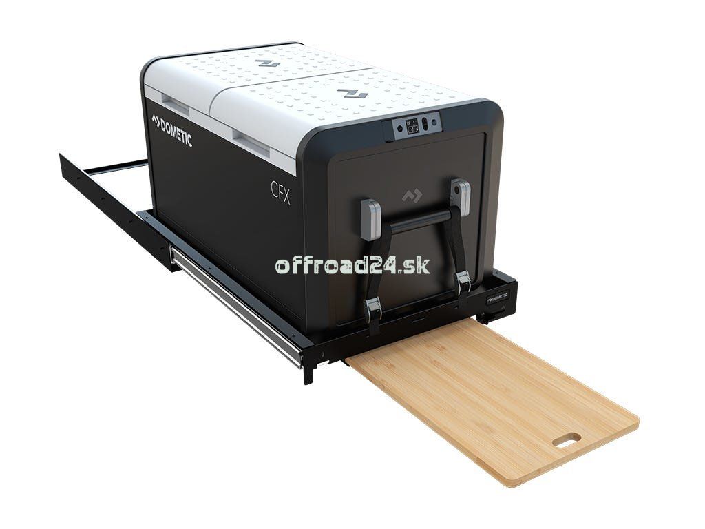 Tento výsuvný systém umožňuje rýchly a jednoduchý prístup k vašej chladničke alebo inému ťažkému vybaveniu pri minimálnych nárokoch na priestor. Možnosť montáže na akýkoľvek rovný povrch, vrátane zásuvkových systémov Front Runner a ložných plôch pickupov. Výsuvná časť poskytuje dodatočnú pracovnú plochu s rozmermi 470 mm x 325 mm. Tento masívny výsuv je ideálny pre chladničky s objemom do 75 l. Montážne otvory sú predvŕtané. Vysokopevnostné ložiská umožňujú vysunutie platformy takmer o 100 % zo základne. Unikátny dizajn zabezpečuje, že výsuv pri zatvorenej polohe nevydáva žiadne zvuky (nehrká). Uzamykateľné rameno bezpečne zaistí zásuvku v zatvorenej polohe. Obsahuje mechanizmus, ktorý zabraňuje samočinnému zatvoreniu výsuvu pri parkovaní na nerovnom povrchu. Povrchová úprava je zhodná s odolným čiernym práškovým lakom strešných nosičov Front Runner Slimline II. Všestranné využitie na prepravu náradia, boxov alebo iného vybavenia. Súčasťou balenia sú štyri (4) upínacie prvky STRA063 na uchytenie chladničky a montážny materiál pre drevené aj kovové povrchy. Tento výsuv je vhodný pre model FRID100.